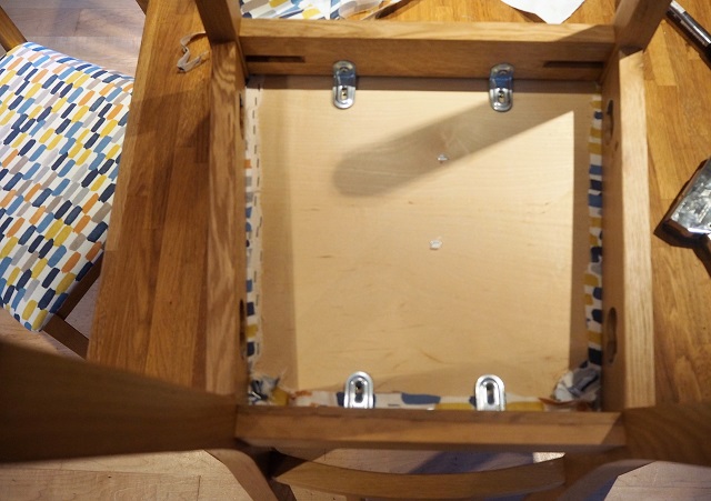 Once you’ve done all the corners, you can make a start of running some staples down the sides. Pull on the excess fabric to make sure it’s tight otherwise you’ll end up with a wrinkly finish. Once all your staples are in, just cut off the excess fabric and screw the seat back into place!
