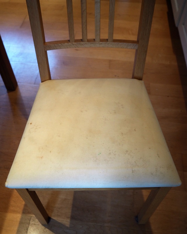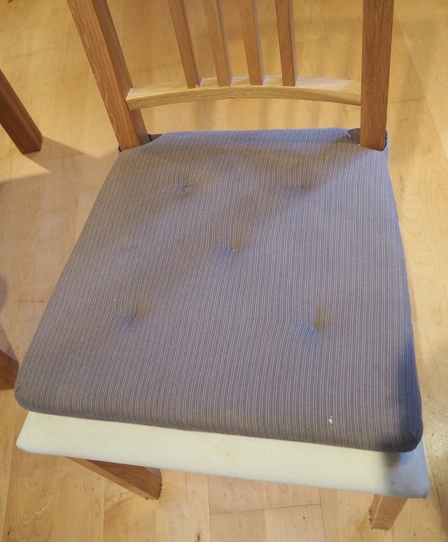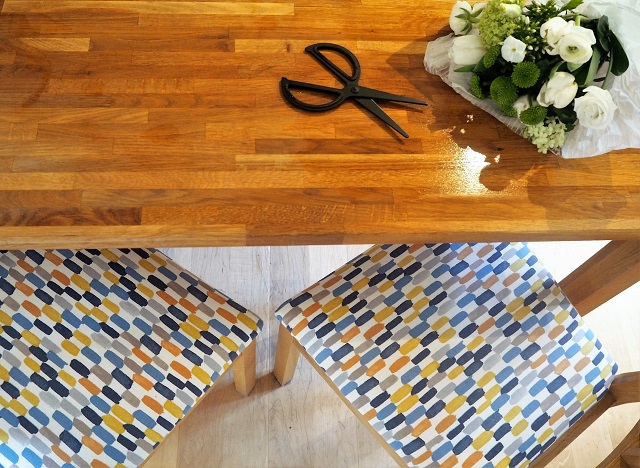 Upholstering a chair is a really easy way to give your dining area a new look. There are so many fantastic fabrics available – and you don’t need much when upholstering a chair seat so it’s an inexpensive way to get a fresh style. For me, the need to re-upholster my dining chairs was because the original fabric was really tired. I used to have a cat (RIP Merlin the British Blue) who loved snuggling down on my dining chairs and they were covered in tiny kitty paw prints! I tried washing the removable covers, but they never came out. So a quick and lazy fix was to pop some IKEA chair cushions on top…