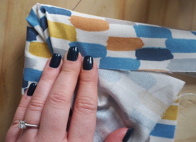 Make sure your fabric is lined up flush with the edge of the seat. Even if you’re using plain fabric – you don’t want the weave to be wonky (sorry I’m a perfectionist!). Grab one edge and gather it over the corner of the seat and try to not have any creases as it ends up looking rubbish. Hold it down tight and pop a few staples in using a staple gun.